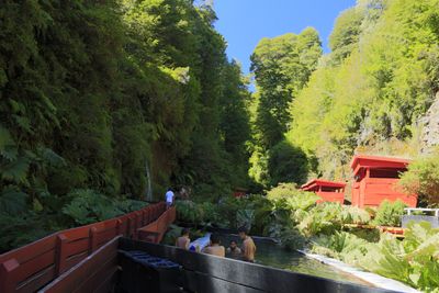 Die Thermalanlage verfügt über achtzehn Steinbecken mit natürlichem Thermalwasser, verbunden durch rote Holzstege durch den einheimischen Wald.