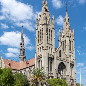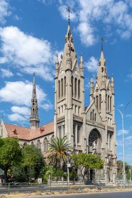 Die Basilika zeigt französische neugotische Architektur mit Zwillingstürmen und Steinsäulen aus den Steinbrüchen von San José de Maipo.