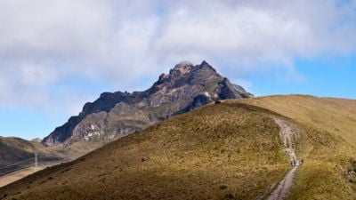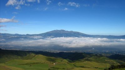 Der Pichincha Vulkan erhebt sich mit zwei Hauptgipfeln, dem Wawa Pichincha mit aktiver Caldera und dem Rucu Pichincha über der Stadt Quito.