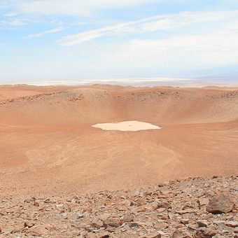 Der Monturaqui-Krater misst 350 Meter im Durchmesser und 34 Meter in der Tiefe, mit einer Salzpfannenformation in seinem Inneren.