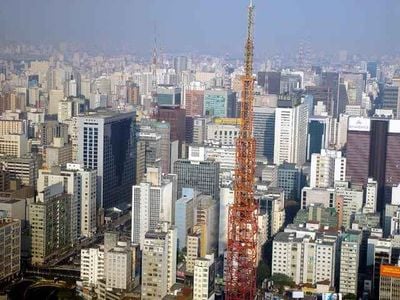 Der Torre TV Bandeirantes ist ein Stahlgitterturm im Stadtteil Consolação und prägt das Skyline-Bild von São Paulo. Die Struktur erhebt sich 212 Meter in die Höhe und zeigt einen Farbverlauf von Rot an der Basis bis Weiß an der Spitze, während die ersten vier Stockwerke aus Beton Studios und Übertragungsausrüstung beherbergen.