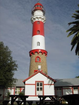 Der Leuchtturm steht im Stadtwappen für das maritime Erbe und dient als Referenz für die deutsche Kolonialarchitektur Swakopmunds.