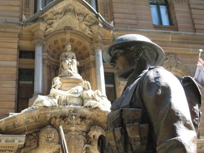 Das Sydney Kenotaph zeigt einen monolithischen Steinblock mit Bronzestatuen eines Soldaten und eines Matrosen an den Enden.