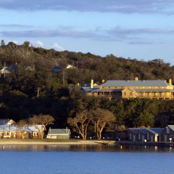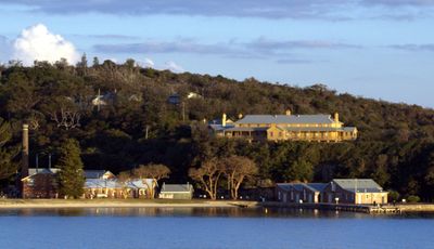 Die North Head Quarantänestation verfügt über Gebäude auf verschiedenen Ebenen, die zu einer geschützten Bucht führen.