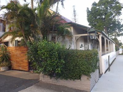 Das Old Cleveland Court House steht an der Paxton Street und zeigt eine bemalte Backsteinstruktur mit einem Wellblechdach und traditionellen Holzpfosten entlang der Veranda. Das Gebäude war ursprünglich als Unterkunft gedacht, wurde aber später für gerichtliche Zwecke umgenutzt und beherbergt heute ein Restaurant mit einem Innenhof.