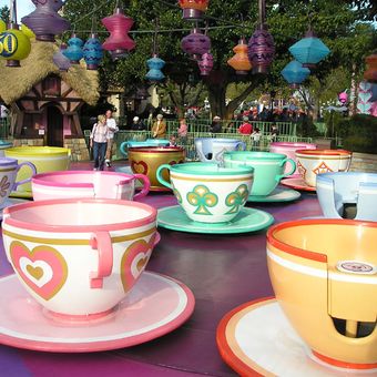 Der englische Name stammt aus dem Filmklassiker von 1951, in dem Alice an einer verrückten Teegesellschaft teilnimmt. Besucher können das mittlere Rad in jeder Tasse selbst drehen und bestimmen, wie schnell sich ihr Gefährt dreht.