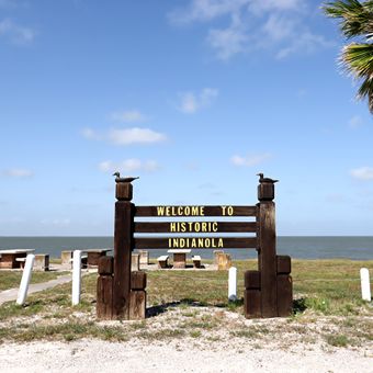 Indianola ist eine Geisterstadt an der Matagorda Bay an der Golfküste von Texas. Das verlassene Gelände zeigt Granitmarkierungen und Fundamentreste des Gerichtshauses, die besonders bei Ebbe sichtbar werden.