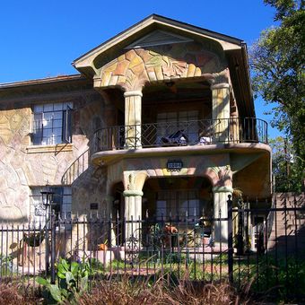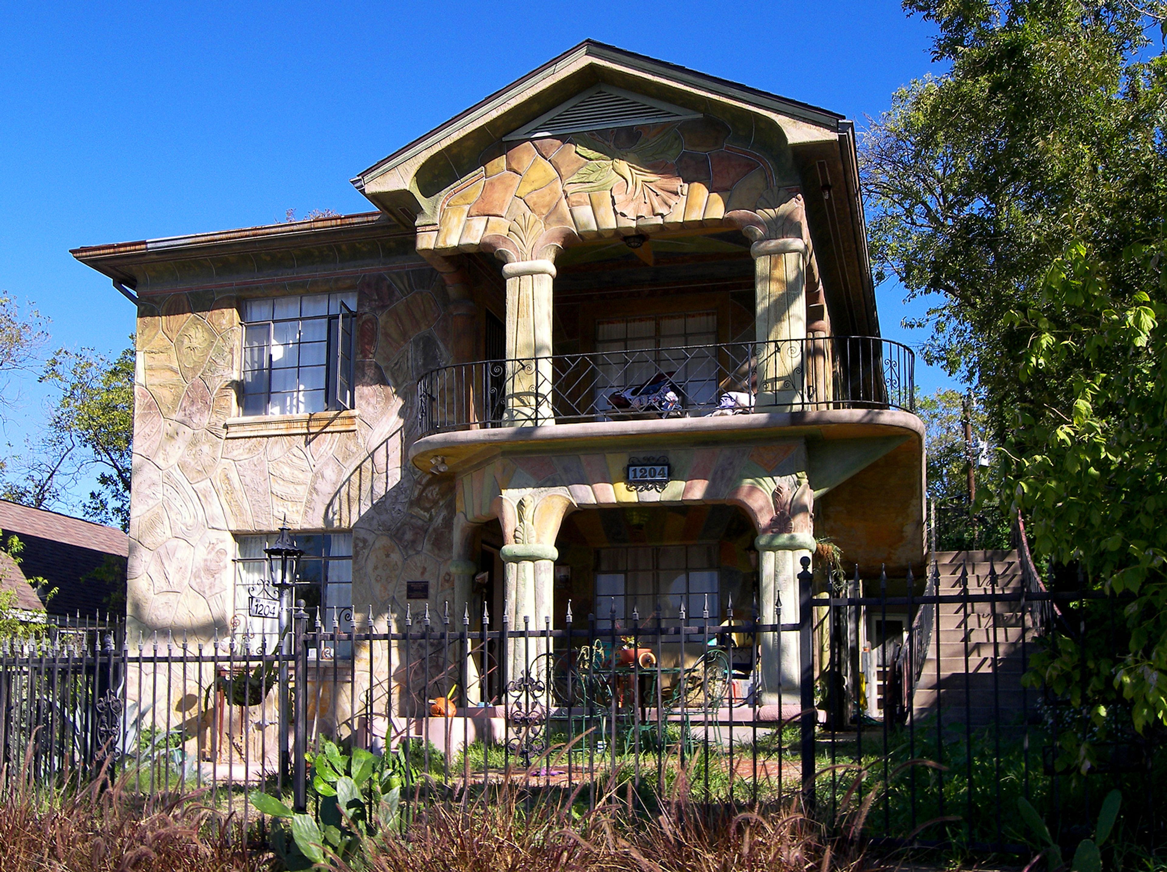 Die Außenwände zeigen farbige Betonbehandlungen, die Texturen ähnlich Naturstein erzeugen und die größte Sammlung in Texas bilden.