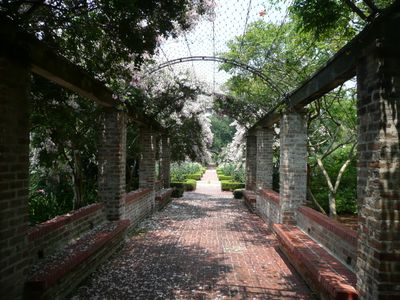 Der Garten erstreckt sich über 5 Hektar mit thematischen Bereichen für Rosen, Schmetterlinge, tropische Pflanzen und heimische Arten aus Louisiana entlang der Wege.