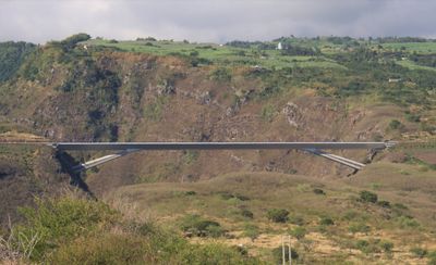 Der Grande-Ravine-Viadukt erstreckt sich über 288 Meter über eine tiefe Schlucht, mit einer Stahldecke gestützt von zwei Spannbetonstreben im 20-Grad-Winkel.