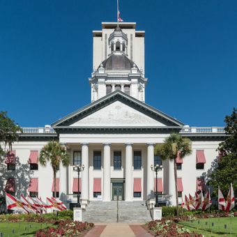 Das Florida State Capitol besteht aus einem 22-stöckigen Turm und dem historischen Gebäude mit neoklassizistischen Elementen und symmetrischen Proportionen.