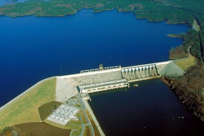 Der Richard B. Russell Staudamm erstreckt sich über 580 Meter über den Savannah River und erhebt sich 64 Meter über das Flussbett mit acht Generatoren.