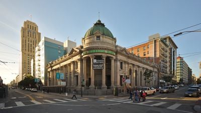 Das Hibernia Bank Building ist ein neoklassizistisches Gebäude im Mid-Market-Viertel mit einer imposanten Kuppeleinfahrt und einer äußeren Kolonnade. Im Inneren befinden sich Tiffany-ähnliche Oberlichtfenster, die die Haupthalle erhellen, sowie ursprüngliche Bankschalter und Tresore.