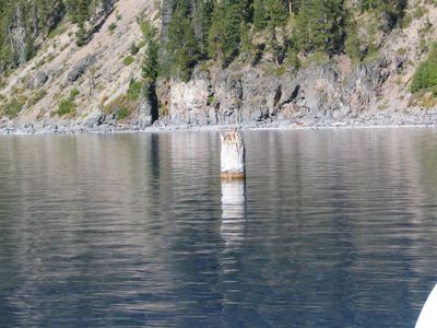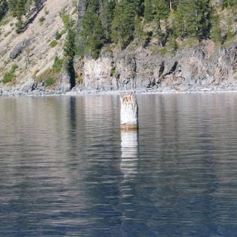 Der Alte Mann vom See ist ein 9 Meter langer Hemlocktannenstamm, der aufrecht in den Gewässern des Crater Lake schwimmt.