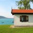 Das kleine Holzgebäude am Attersee verfügt über dreiseitige Fenster und eine Glastür, ausgestattet mit grundlegenden Möbeln und einem Klavier.