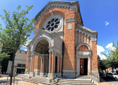 Die Chiesa del Sacro Cuore zeigt drei Abschnitte an ihrer Fassade mit einem zentralen kreisförmigen Rosettenfenster über dem Eingangsportal.