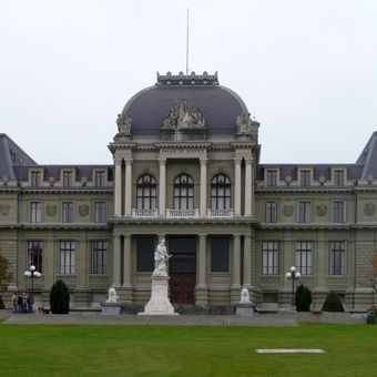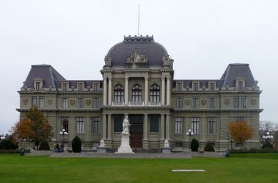 Das Gebäude im Renaissancestil steht auf dem Gipfel des Montbenon-Hügels und zeigt kunstvolle Skulpturen und Embleme an seiner symmetrischen Fassade.