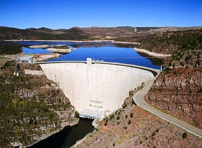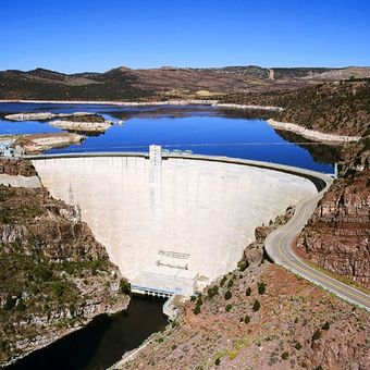 Der Bogenstaumauer aus Beton erstreckt sich 392 Meter über den Green River und erreicht eine Höhe von 1.841 Metern.