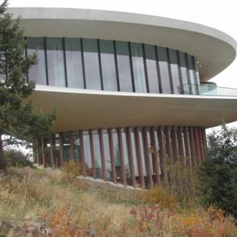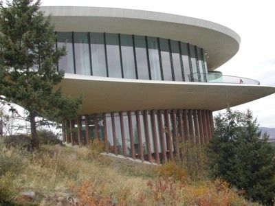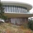 Die muschelförmige Außenfassade verbindet Glas, Metall und Beton, die aus dem Berghang in einer durchgehenden Form hervortreten.