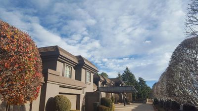Das 1300 Quadratmeter große Anwesen verfügt über mehrere Ebenen mit einem Hauptsaal für 200 Personen, Außenpools und einer beheizten Auffahrt.