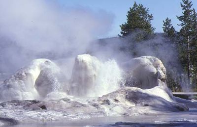 Der Grotto-Geysir weist einen zwei Meter hohen Kegel mit fehlenden Abschnitten und kalzifizierten Bäumen auf, die Zinnen um die Öffnung bilden.