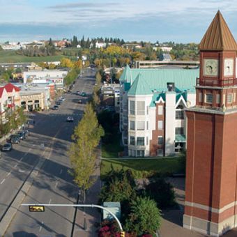 St. Albert erstreckt sich entlang des Sturgeon River nordwestlich von Edmonton, mit Wohnvierteln umgeben von landwirtschaftlichen Flächen.