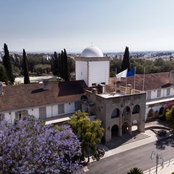 Der Präsidentenpalast steht in einem Kiefernwald im Bezirk Strovolos, mit Kalksteinmauern und einem zentralen Turm mit Kuppel.
