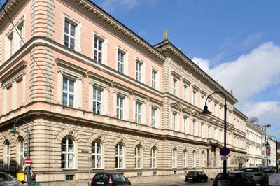 Das Akademische Gymnasium befindet sich in einem dreistöckigen Gebäude an der Spittelwiese im Linzer Innenstadtbezirk mit quadrierten Wänden und geometrischen Ecken.
