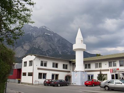 Die Moschee in Telfs ist ein Gebetshaus mit traditionellen islamischen Elementen und einem Minarett, das sich über den Hauptgebetsraum erhebt. Der Bau bietet Platz für Gläubige und wird als Ort für tägliche Gebete sowie für Gemeinschaftstreffen genutzt.