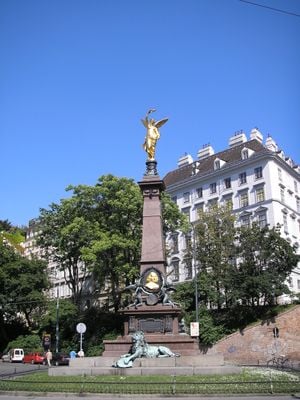 Das Denkmal zeigt Bronzefiguren der Victoria, der römischen Siegesgöttin, und zwei geflügelte Figuren mit Lorbeerkränzen.