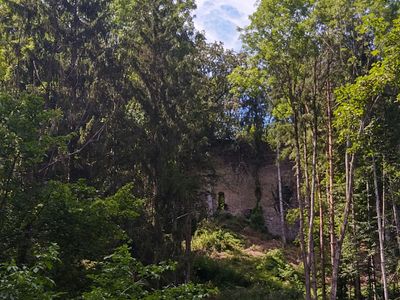Die steinernen Überreste der Burg Pfannberg stehen auf einem steilen Hügel, mit Mauern die sich über drei Seiten der bewaldeten Erhebung erstrecken.