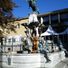 Der Leopoldsbrunnen zeigt eine zentrale Reiterstatue von Erzherzog Leopold V auf einem verzierten Steinsockel mit Wasserelementen am Fundament.
