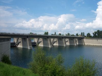 Das Wehr 1 verbindet eine Spannbetonbrücke mit einem Wasserregulierungssystem an der Donau und nutzt dabei moderne ingenieurtechnische Methoden.