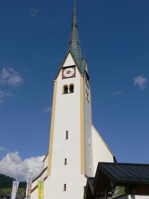 Die Pfarrkirche Sankt Blasius zeigt einen markanten Glockenturm und architektonische Elemente, die für österreichische Kirchenbauten charakteristisch sind.