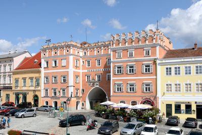 Verderberhaus, Denkmalgeschütztes Gebäude am Hauptplatz, Retz, Österreich.