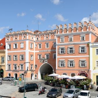 Die Struktur vereint zwei verschiedene Hausnummern, 2 und 34, in einer einzigen architektonischen Einheit am Hauptplatz von Retz.