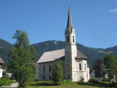 Die Kirche steht gegenüber dem Brigittaheim, mit lokalen Einrichtungen in einem Kilometer Entfernung und Verkehrsanbindung vom Bahnhof Steeg-Gosau.