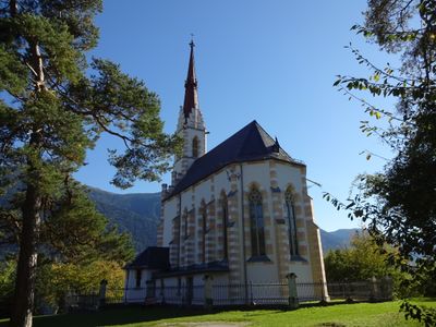 Die Maria Locherboden Kirche steht 150 Meter über dem Inntal auf dem Sassberg und bietet Ausblicke auf das Mieminger Plateau.