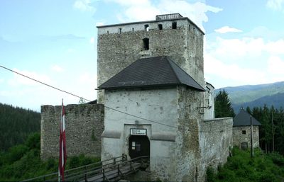 Die Steinbefestigung steht auf 588 Metern Höhe mit Verteidigungsmauern und einem Aussichtsturm mit Blick über das Mürztal.