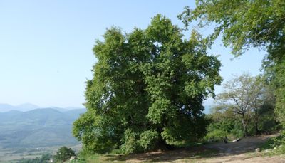 Das Tnjri ist eine orientalische Platane mit einem massiven Stamm und ausgedehnten Ästen in der Nähe des Dorfes Şıx Dursun. Die mächtigen Wurzeln und der breite Kronendach prägen die Landschaft und bieten Schutz vor der Sonne.
