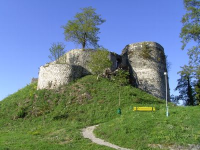 Die Steinbefestigung steht auf erhöhtem Gelände, mit Mauern und Fundamenten, die mittelalterliche Bautechniken und Verteidigungsarchitektur zeigen.