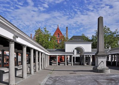 Der Vismarkt weist eine klassische Kolonnade aus dem Jahr 1820 auf, wo Händler frische Meeresfrüchte aus der Nordsee anbieten.