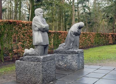 Trauerndes Elternpaar, Gedenkstatue auf deutschem Soldatenfriedhof in Vladslo, Belgien.