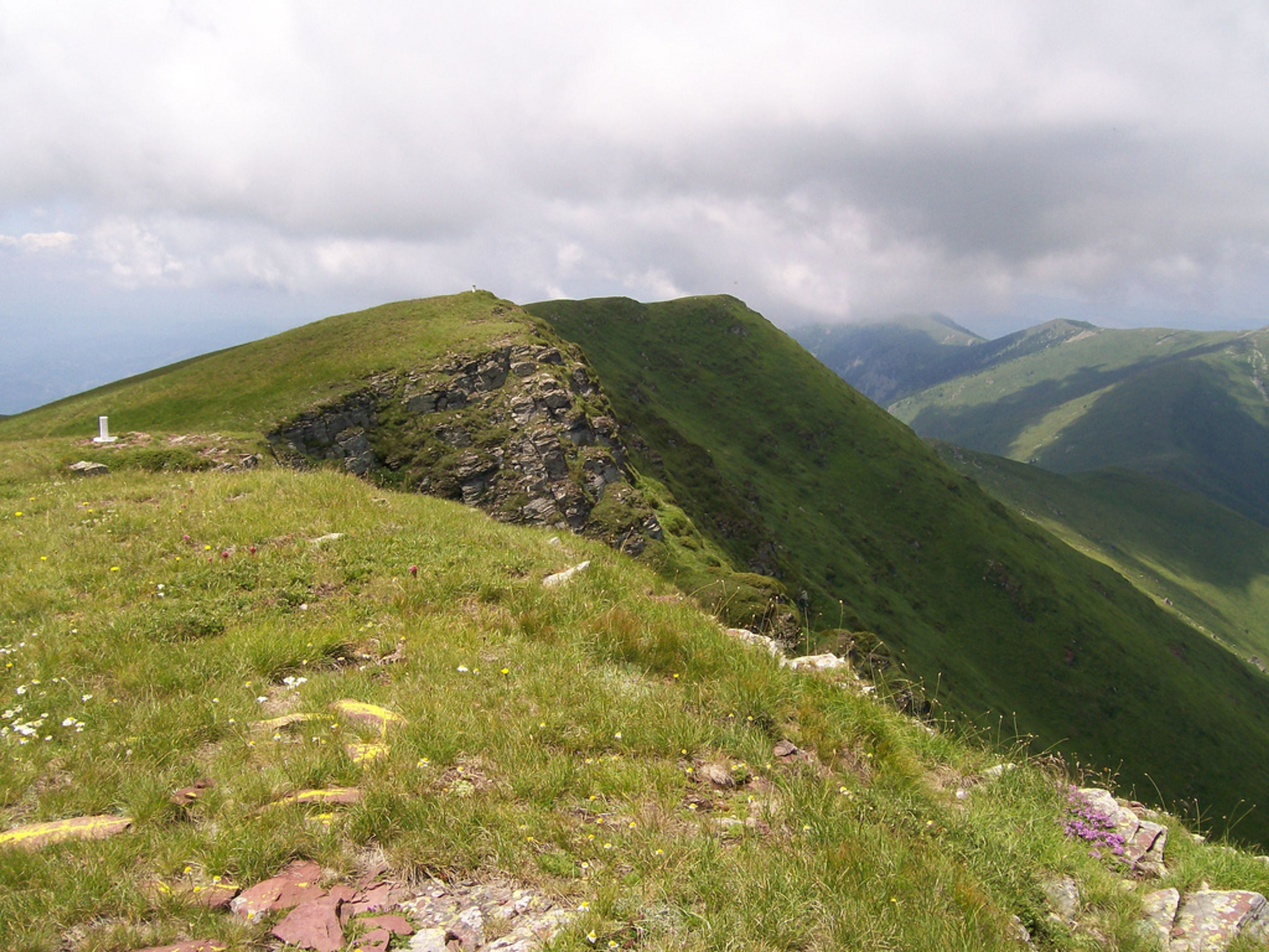 Der Midžor-Gipfel erreicht eine Höhe von 2169 Metern im Balkangebirge, mit felsigen Hängen im Norden und Grasflächen in anderen Bereichen.