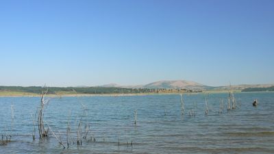 Der Stausee liegt 60 Meter über der Stadt Montana und fasst ein Volumen von 384 Millionen Kubikmetern.