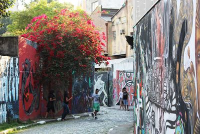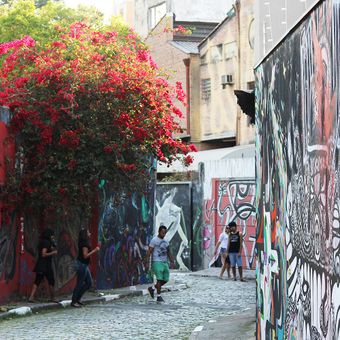 Drei miteinander verbundene Gassen bilden Beco do Batman, wo Wände und Gehwege eine umfangreiche Sammlung von Wandgemälden präsentieren.