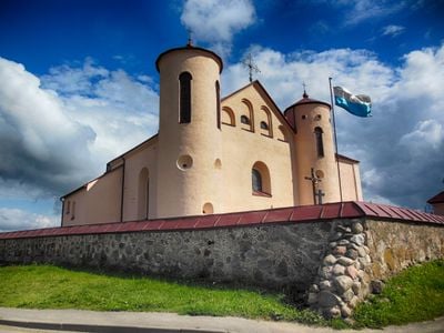Jan Rudomina gründete dieses religiöse Bauwerk 1606, das später durch russische Streitkräfte und schwedisches Kanonenfeuer beschädigt wurde.