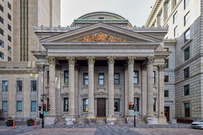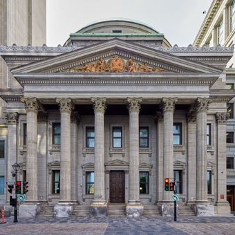 Der Hauptsitz der Bank von Montreal steht gegenüber der Notre-Dame-Basilika am Place d'Armes mit einer neoklassizistischen Fassade.