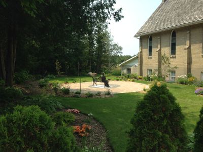 Die graue Steinstruktur der St. Paul's Presbyterianischen Kirche steht auf ihrem Grundstück mit einem Kirchturm, der in den Himmel Ontarios ragt.