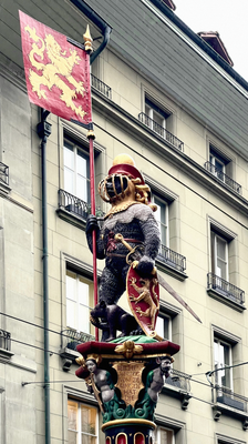 Der Zähringerbrunnen zeigt eine zentrale Statue eines gepanzerten Bären, der Schild und Banner mit dem goldenen Zähringer Löwen trägt.